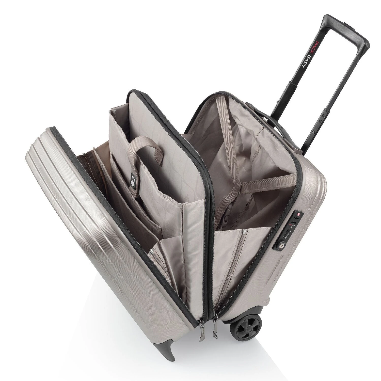 Stilsicherer und praktischer 2-Rollen Businesstrolley mit Laptop- und Tabletfach im Inneren und weiterem Stauraum für Kleidungsstücke inkl. Kreuzpackgurt. Zusätzlich ausgestattet mit einem integrierten TSA-Schloss für mehr Sicherheit.