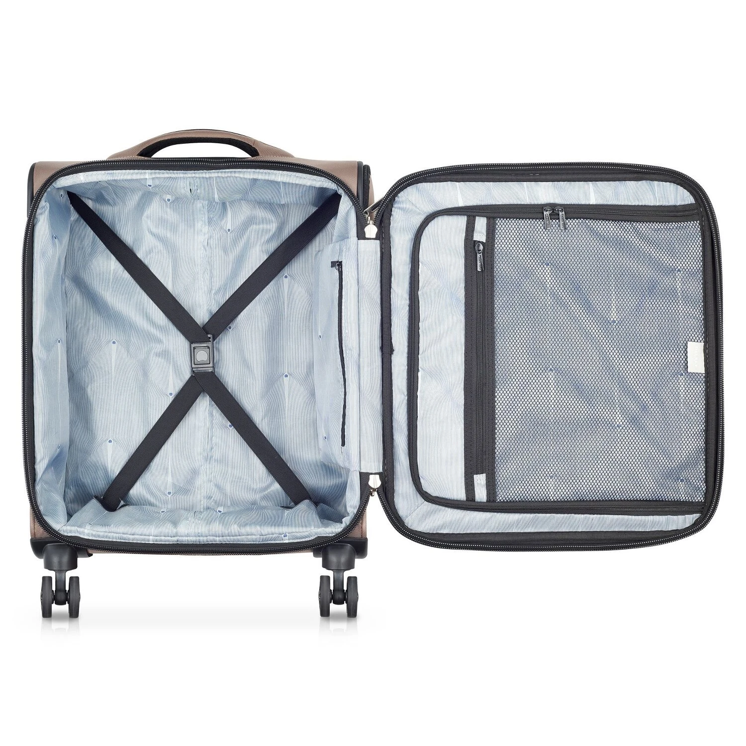 Komfortabler Kabinentrolley von Delsey aus strapazierfähigem Polyester. Der Koffer bietet genug Platz für alles was auf einer Reise benötigt wird inkl. Reißverschlussfächer und verfügt über ein integriertes TSA-Schloss für mehr Sicherheit. Ein arretierbarer Griff mit 4 Rollen sowie ein Tragegriff sorgen für Mobilitätsmöglichkeiten.