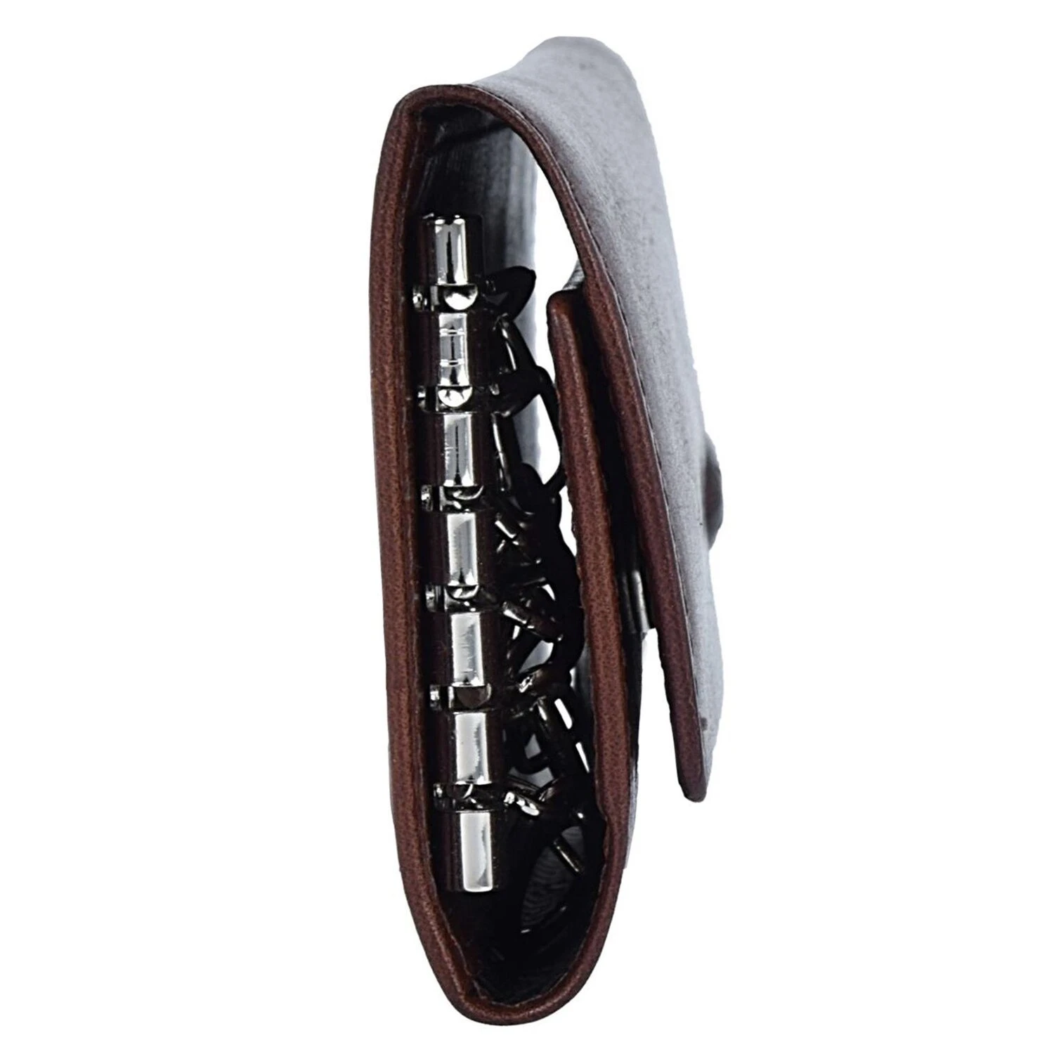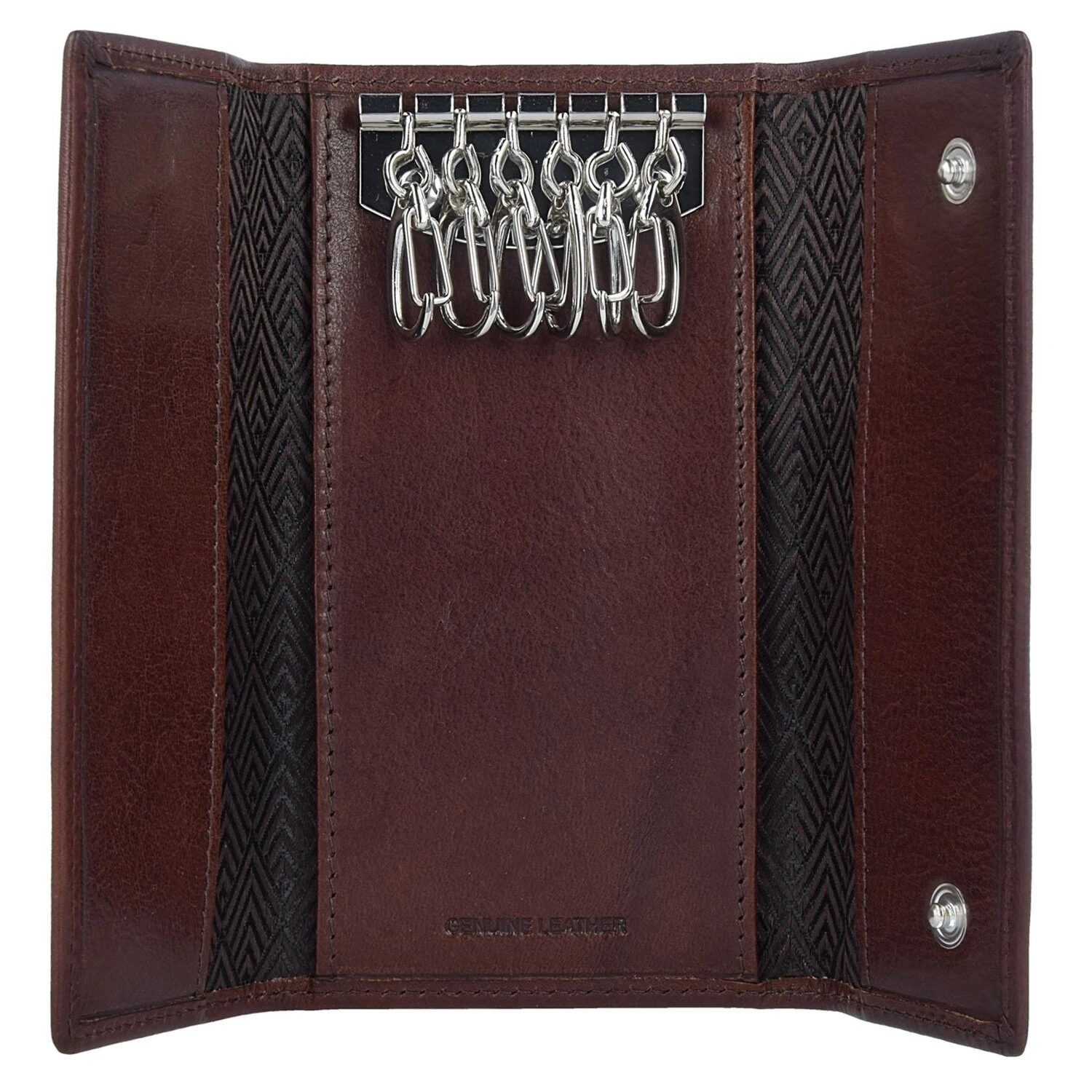Modisches, handliches Druckknopf-Schlüsseletui mit Schlüsselkarabinern für den modebewussten Mann aus edlem, weichem, pflanzlich gegerbtem Leder. Das Etui bietet genug Stauraum für sechs Schlüssel und ist dank der hervorragenden Verarbeitung, der Logoprägung und des schlichten Designs einen echten Hingucker.