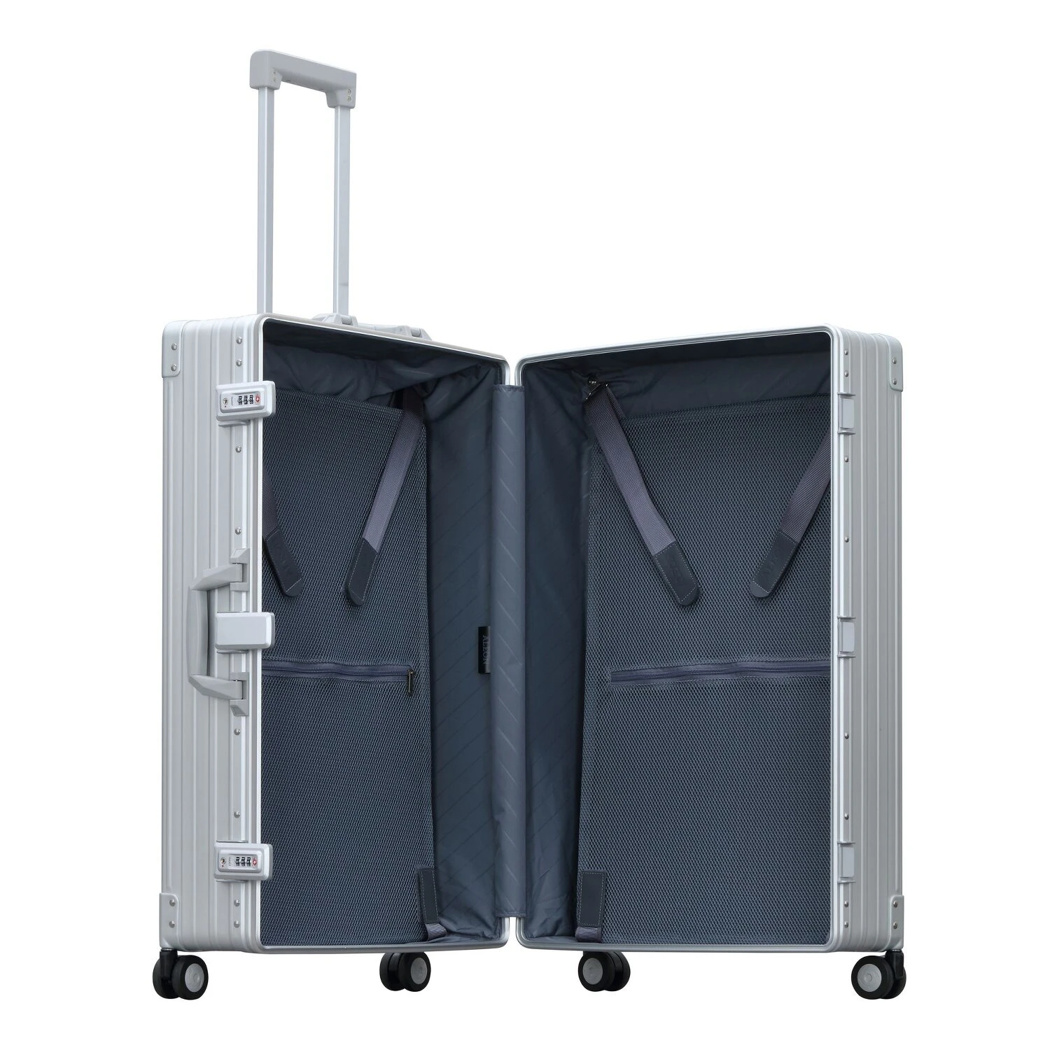Zeitlose Eleganz und höchste Qualität vereinen sich in diesem Trolley aus hochwertigem Aluminium. Mit seiner durchdachten und intelligent angelegten Innenaufteilung bietet der Koffer gute Übersicht. Zwei TSA-Schlösser für mehr Sicherheit sowie vier geräuscharme und in alle Richtungen bewegliche Doppelrollen runden das Design ab. Der komfortable Begleiter für den Urlaub.