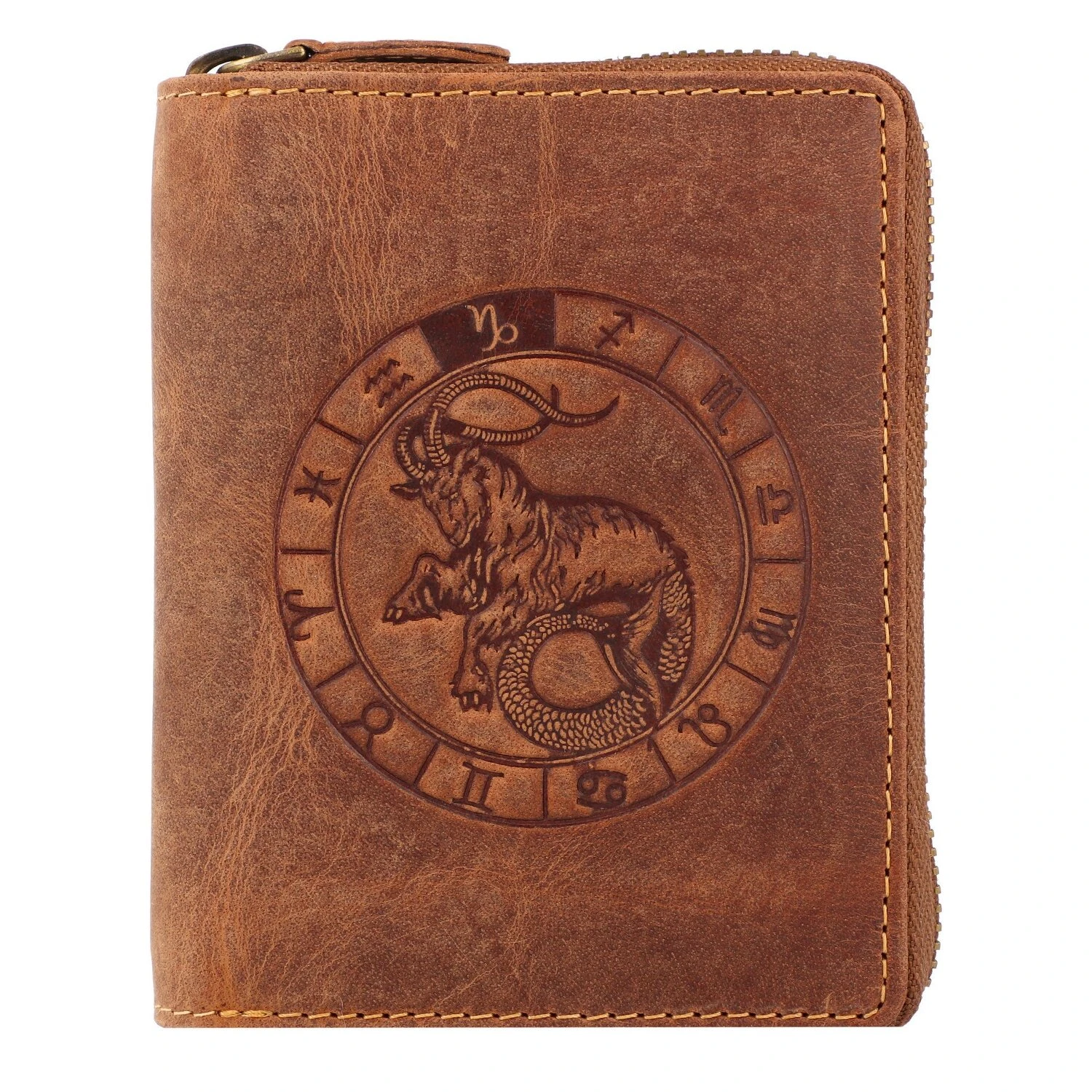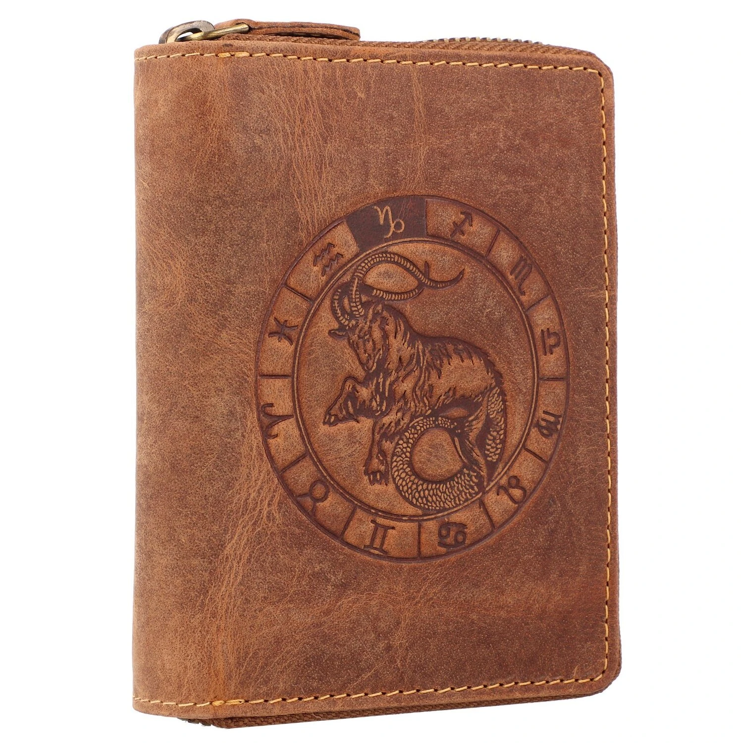 Wunderschöne Geldbörse von Greenburry aus Leder mit geprägtem Sternzeichen-Motiv auf der Frontseite. Der Geldbeutel bietet reichlich Platz für Kreditkarten, Scheine und Münzen.
